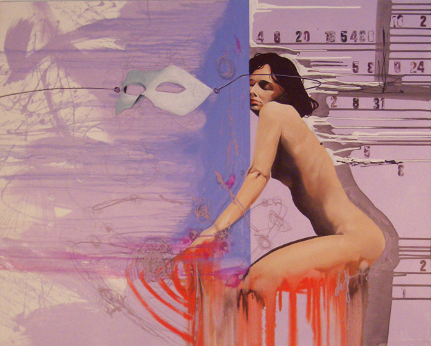 Nell'ambito di una poetica dello smarrimento dell'io contemporaneo, l'opera di Mauro Molle s'interroga sul valore etico della Bellezza, in un tempo che ha sconsacrato l'antico ideale del bello relegandolo negli apparati della comunicazione visiva più volgare. Le sue figure femminili, molli e seducenti, denudate dai preconcetti di un conformismo ipocrita, bloccate in pose dinamiche, appaiono come un'avvincente still life in cui regna un perturbante spaesamento. Popolano le tele di Molle donne che si offrono frastornate all'indifferenza del mondo, corpi in bilico sulle incongruenze di un alienante presente, immersi in un contesto denso di allusioni inconsce. Impronte di mani, allarmanti manichini, improbabili strumenti musicali, armi vere o trasparenti sagome di esse, matriosche, bautte (maschere) veneziane sono indizi e suggerimenti offerti o contraddetti da un addensarsi di linee e di cromie. Alla verosimiglianza di sensuali nudi si giustappongono, senza cesure stilistiche, segni astratti vaganti in uno spazio a-prospettico, simboli e dissolvenze quali frammenti di una realtà enigmatica che interroga e inquieta. Le figure, dipinte di schiena o celate in parte allo sguardo dello spettatore da nervosi graffiti, esprimono una moderna incomunicabilità attraverso la solitudine di gesti sospesi ed un'oppiacea fuga da un mondo dove non esiste un altro essere vivente con cui condividere le emozioni. |